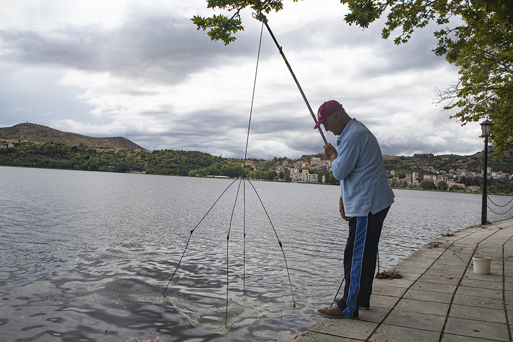 Eine etwas eigenartig aussehende Angelrute hat uns bei unserem Spaziergang entlang des Kastoria-Sees auf einen Fischer aufmerksam gemacht. Irgendwie sah es so aus, als würde er nur das Laub aus dem See fischen. Interessiert blieben wir stehen und schauten ihm über die Schulter und kamen ins Gespräch (was auf Griechisch noch immer eine große Hürde darstellt, aber man wächst ja mit den Aufgaben).