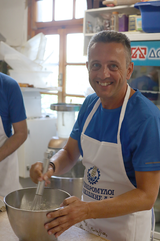 Bevor es los ging erzählte uns Kostas aber kurz die Geschichte der Bäckerei, die sein Vater gründete, der im Ort eine Schafszucht betrieb. Als der örtliche Bäcker beschloss in den Ruhestand zu gehen, ergriffen die Eltern von Kostas die Chance diesen Platz einzunehmen und bauten eine neue Bäckerei auf. Wobei sie auf keinerlei Fachwissen zurückgreifen konnten. Alles war also „learning by doing“. Schon mit jungen Jahren stieg Kostas mit ein und eignete sich sein Fachwissen an. Seit nunmehr 25 Jahren ist er Handwerksbäcker und besonders stolz auf seinen eigenen Sauerteig und seine vielen kreativen Kreationen, die er in seiner Bäckerei umsetzen kann.