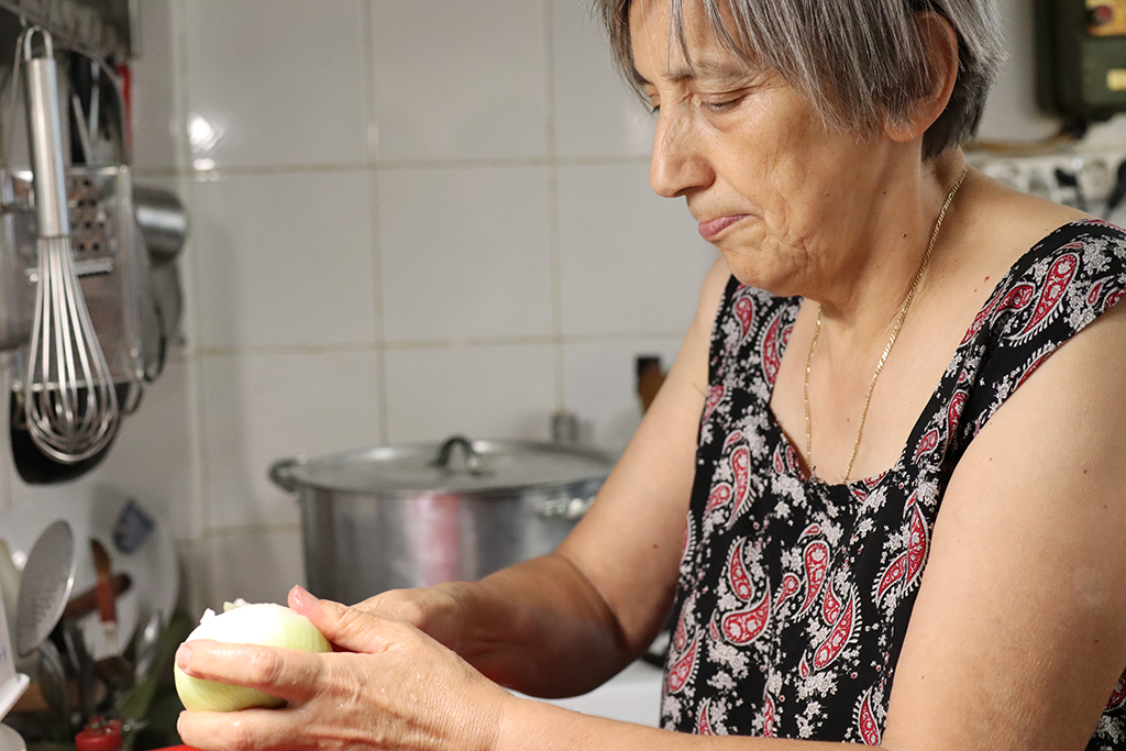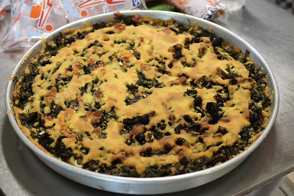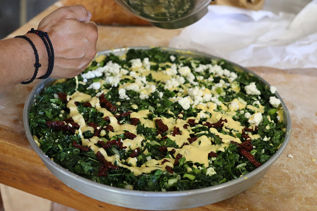 Noch während die Alevropita im Ofen war, ging es schon an die zweite Pita. Eine vor allem in dieser Region sehr bekannte Version mit Spinat, Kräutern und Feta-Käse. Sehr ähnlich wie die überall in Griechenland bekannte „Spanakopita“. Hier wird allerdings kein Fillo-Teig verwendet, sondern der Teig erinnert eher an eine Tarte. Wir versuchten uns also an einer Platsopita. Und hier bekamen wir Unterstützung von Vassiliki, der Mutter von Kostas. Sie hatte im Garten schon Spinat, Jungzwiebel, Minze und andere Kräuter geerntet, die nun unsere Fülle ergaben.