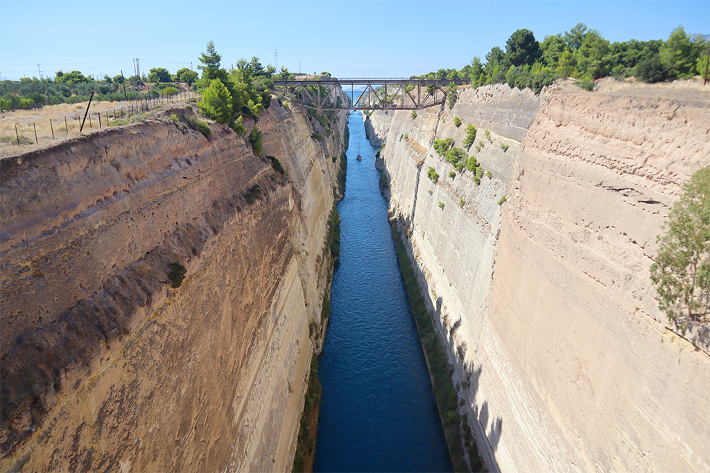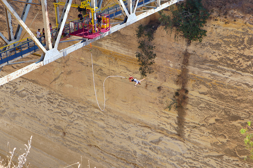 Und Brückengeschichte Nummer 3! Den Kanal von Korinth queren ja mittlerweile mehrere Brücken. Die große Autobahnbrücke und auch die Brücke der alten Nationalstraße. Wenn man hier einen Stopp einlegt, dann hat man nicht nur einen wunderbaren Blick in den Kanal von Korinth, sondern kann auch jenen wagemutigen Personen zusehen, die sich hier im Bungee-Jumping versuchen.