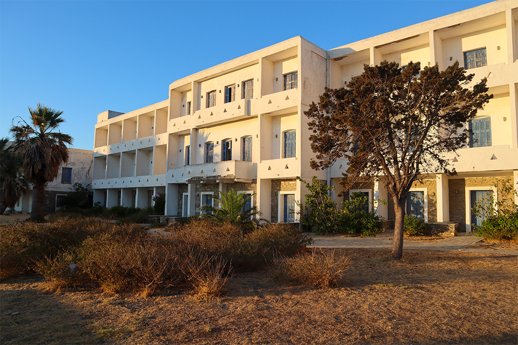 Ein erster kurzer Ausflug führte uns dann in den kleinen Hafenort Loutra. Tavernen mit Tischen direkt am Meer (bei stärkerem Wellenbad mit Fußwäsche inklusive) und ein paar Geschäfte sind hier zu finden. Und auch ein ehemaliger Touristenmagnet. In Loutra gibt es nämlich Heilquellen und ein Relikt davon ist ein ziemlich großes Heilbad, welches nun allerdings leer und etwas trostlos dasteht. Die heiße Quelle kann aber trotzdem weiterhin genutzt werden, denn in einem kleinen Bach fließt das dampfend, heiße Wasser ins Meer und dort kann man sich dann hineinlegen. Vermischt mit dem kühlen Meerwasser soll diese Behandlung gut gegen Muskel-, Nerven- und Knochenschmerzen sein. Von früh bis spät wird dieses kleine Becken auch ausgiebig genutzt.