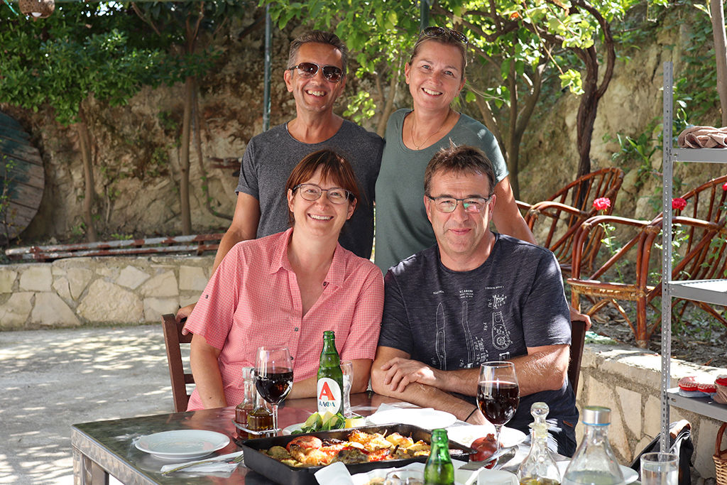 Es sollte ein Überraschungstag werden. Naja, eigentlich war der Tag ein vorgezogenes Geschenk zum Geburtstag von Susi. Aber es war für uns alle ein ganz wunderbarer Tag und ein Geschenk! Wohin die Reise ging wussten nur Evi und Mike. Über die Autobahn Richtung Westen. An Heraklion vorbei und dann ein Schwenk Richtung Süden. Mitten im nirgendwo lenkte Mike das Auto auf einen „Parkplatz“ neben der Straße. Wo sind wir da? Ein Restaurant – am Vormittag? Keine anderen Gäste?