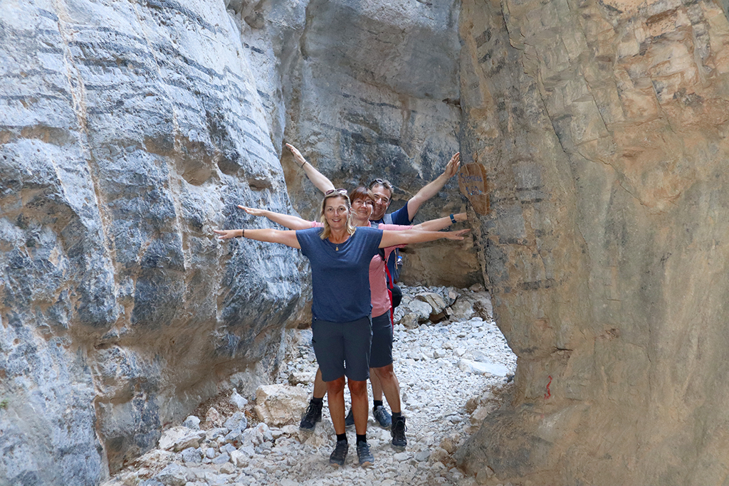Die Imbros-Schlucht wird auch gerne als kleine Schwester der Samaria-Schlucht bezeichnet und im Anstieg sind rund 570 Höhenmeter zu bewältigen. An der engsten Stelle ist die Schlucht gerade einmal 1,6 Meter breit. Da wir die Schlucht von unten nach oben gingen und alle anderen eigentlich immer den umgekehrten Weg wählen, waren wir bis fast zum oberen Ausstieg eigentlich alleine unterwegs. Ein besonderes Erlebnis, nur beäugt von ein paar Ziegen und den oberhalb der Schlucht kreisenden Vögel. Bei einem ausgiebigen Frühstück an unserem Zielpunkt konnten wir uns nach der Wanderung ordentlich stärken.