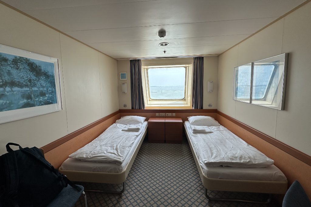 Auf der Fähre selbst dann eine weitere glückliche Fügung. Unsere Kabinenbuchung lautete Außenkabine mit Fenster. Bekommen haben wir die Luxusvariante mit Blick auf den Bug. Front de Luxe. So beginnt die Reise gleich sehr gut.